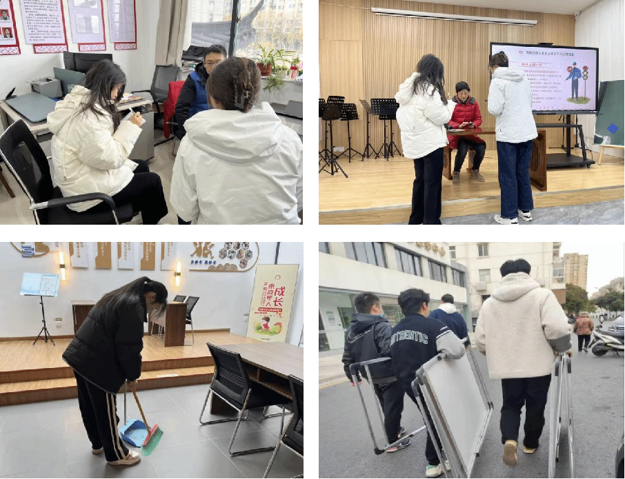 志愿服务间隙,志愿者对社区工作人员开展访谈,了解到社区工作及居民活动情况,台球、棋牌、绘画、阅读等活动丰富多彩。志愿者还前往新时代文明实践中心,学习交通安全知识。