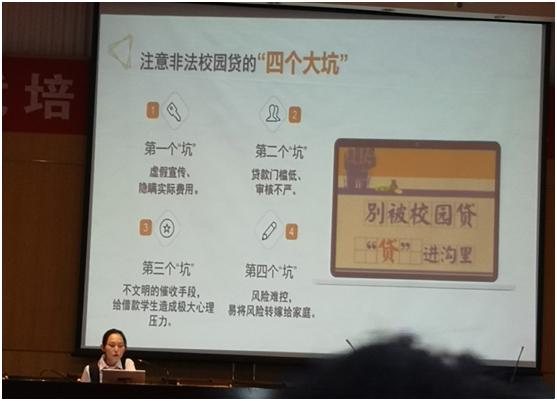 宋闻宇在讲座中向大家普及了非法校园贷的多种骗局,如“培训贷”、“回租贷”、“裸条贷”等多种形式。她指出非法校园贷有以下四个特点:一是虚假宣传、隐瞒实际费用;二是贷款门槛低、审核不严;三是不文明催收,给借款员工极大心理压力;四是风险难以控制、会转嫁给家庭。为提醒员工提防各式各样的金融诈骗,宋闻宇告诫同学们一定要树立理性的消费观,切勿盲目攀比,做到量入为出、理性消费,一旦遇到诈骗行为要学会使用法律武器保护自己。
