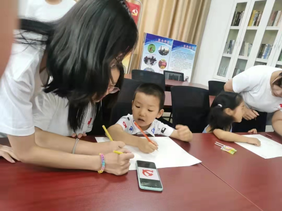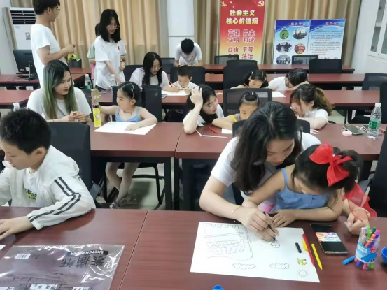 社区小朋友们在支部党员同学的指导下通过画党徽、绘党旗——“童心向党”红色绘画形式诠释着孩子们对中国共产党的崇敬之意。活动中,一位小朋友说:“我一定要好好学习,长大报效祖国。”这一举动让在场所有人倍感欣慰。红色主题教育要从娃娃抓起,支部同学通过开展讲述红色小故事、亲手绘画红色画卷,培养了小朋友的民族自豪感,引导他们感恩党、感恩祖国。
