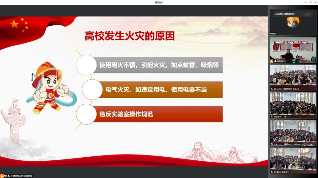 张晓东围绕“老员工安全教育”,讲解老员工为何要重视安全教育、安全教育的目的、安全教育内容,着重讲述了维护重点领域国家安全、国土安全、经济安全、社会安全、粮食安全及网络安全的重要性。他结合案例,讲解消防安全、交通安全、人身安全、财产安全等领域受到危害的主要形式及处理方法,提醒同学们注意宿舍用电安全、防火防盗、防范电信诈骗,教育同学们居安思危,在校园生活中不断提高安全意识,保护生命财产安全,引导同学们关注国家安全、维护国家安全、理解政治安全、重视社会安全、警惕网络安全以及保护好自身安全,为平安校园建设贡献青春力量。