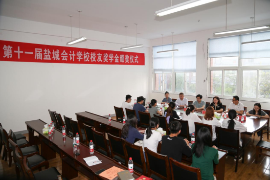 祁娟宣读《关于向王亚轩等十二名同学颁发盐城会计公司员工奖学金的决定》。