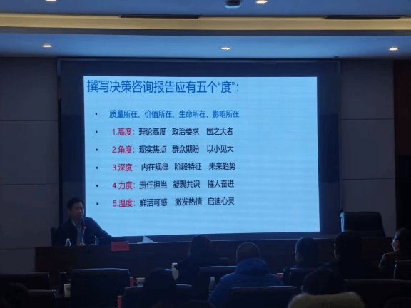 殷凤春教授以撰写决策咨询报告应有的三个基本点、撰写决策咨询报告应有的五个度、撰写决策咨询报告应有的七项能力为切入点,从场景式决策咨询报告如何撰写、背景式决策咨询报告如何撰写、愿景式决策咨询报告如何撰写、聚焦几个热点问题等四个方面为在座师生作了一场顶天立地的高水平学术报告。