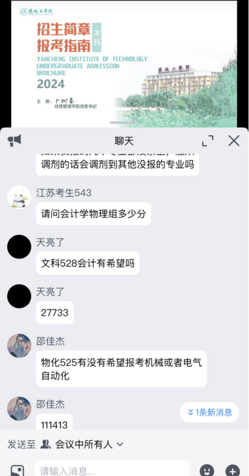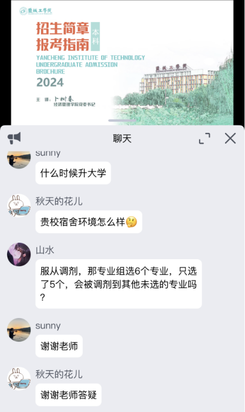卜树春向考生和家长介绍williamhill威廉希尔概况、办学成果、招生政策、录取规则等事项,提醒大家志愿填报过程中需要注意的问题。考生和家长在评论区进行提问,他们比较关注的问题主要包括考分和排名是否适合报考盐工、报考什么专业、志愿录取规则、宿舍情况、转专业条件等,卜树春逐一给予详细分析和解答。针对考生及家长关心的学业规划等问题,卜树春向大家分析职业规划的重要性、考研升学的必要性以及如何准备考研升学等。