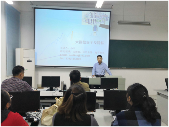 10月24日下午,孙立老师在仁和楼B106作题为《大数据安全及隐私》的学术报告,williamhill管理科学与工程系主任杨斌主持报告会,专业系大数据研究方向的老师聆听了报告。孙立老师围绕大数据安全、隐私及其保护、信息安全技术三个方向对大数据安全进行了详细介绍,并结合主持结项的科技厅产学研课题《智慧云制造背景下工业大数据集成平台开发及关键技术研究》分析了大数据加密、脱敏、安全传输等工程实践应用特点和实施思路。报告图文并茂、内容丰富、技术性强,开阔了教师们的视野,进一步激发了教师投身大数据研究与应用的热情。