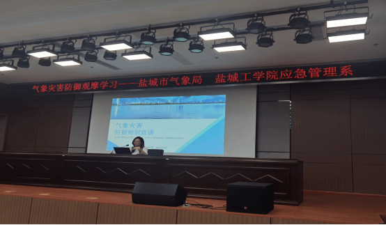 观摩结束后由市气象台台长、市气象学会秘书长周宏伟作题为《气象灾害防御知识宣讲》的报告,报告分为四个部分:盐城气候特征、灾害性天气简述、气象灾害防御、应对气候变化等,周台长通过图文并茂的方式详细讲解了我市常见气象灾害类型及防御应对措施、我市气象灾害应急预案体系及其地位、气象灾害监测和预警技术等。