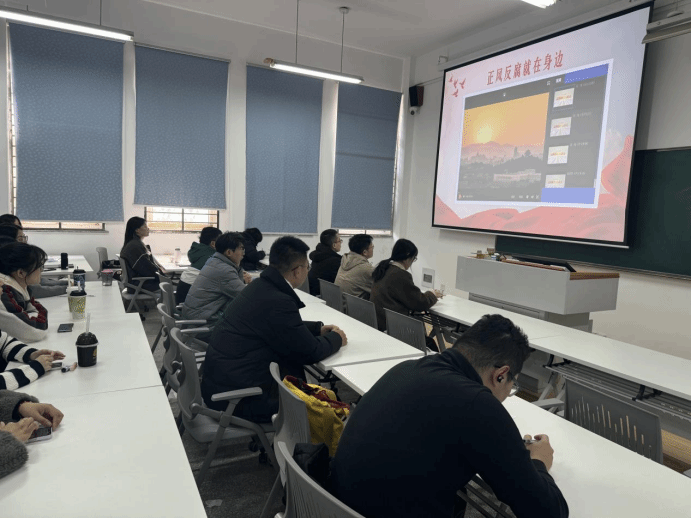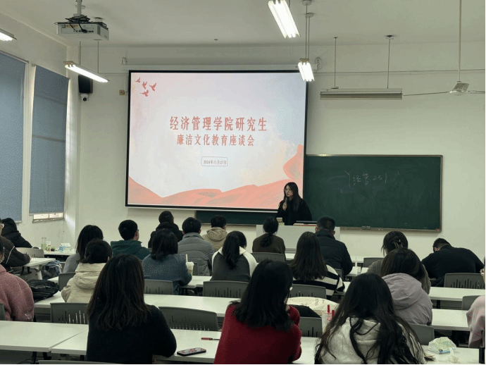 蒋恩录首先为同学们讲解了党的十八大以来,以习近平同志为核心的党中央高度重视党风廉政建设和反腐败斗争,为同学们传达相关会议精神。其次指出研究生作为新生力量,要树立好正确的人生观价值观,增强廉洁文化意识,抵制各种不正当的风气。