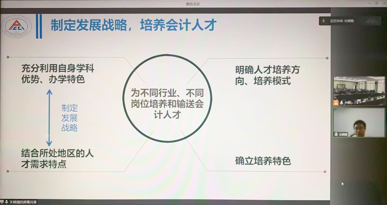 12月12日,在希望大道校区行政楼9楼视频会议室,中国人民大学杰出学者特聘教授支晓强应邀作《培养守正创新的卓越会计人才》报告。董事长、党委副书记邵荣出席,党委常委、副董事长崔刚主持报告会。研究生院、财务处负责人,williamhill班子成员、会计学系全体教师参加。