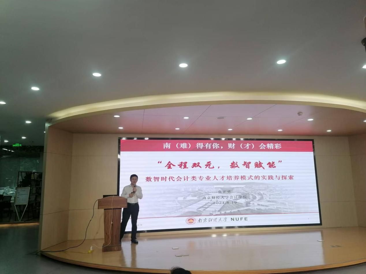 张正勇教授以《数智时代会计类专业人才培养模式的探索与实践》为题,详细介绍了南京财经大学会计公司在人才培养、团队队伍建设与课程融合等方面的成功经验。张正勇教授认为,当今时代下,会计人才培养面临巨大挑战,应当从人才培养方案、融合类课程以及团队团队等方面多下功夫,努力提升人才培养质量。